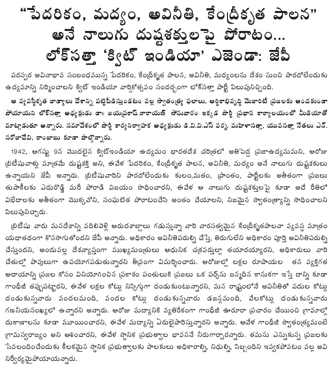 The Lok Satta Party observed the Quit India anniversary today by calling for a movement to rid the country of the four evils of poverty, centralization of power, corruption, and liquor -- all of which are inter-related.