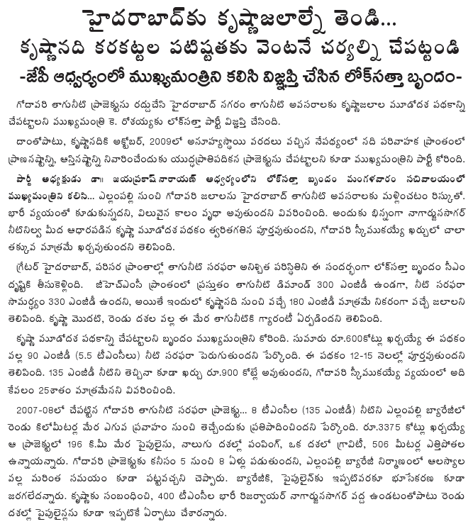 A Lok Satta Party delegation, led by its President Dr. Jayaprakash Narayan, called on the Chief Minister at the Secretariat and explained that tapping the Godavari at Yellampalli for Hyderabad’s drinking water needs is risky, costly, and time consuming. In contrast, the Krishna Phase III scheme has a dependable water source in Nagarjunasagar, can be executed fast, and costs only a fraction of the Godavari’s scheme.