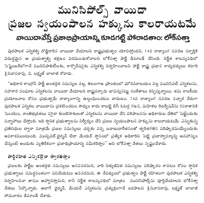 Mr. Mullapally Ramachandran, Union Minister of State for Home Affairs, conveyed this to Lok Satta Party President Dr. Jayaprakash Narayan in response to his representation to Prime Minister Dr. Manmohan Singh during his visit to Hyderabad on October 9, 2009. Party leaders Mr. Katari Srinivasa Rao and Mrs. N. Saroja Devi gave the gist of the communication received from the Union Minister at a media briefing here today.