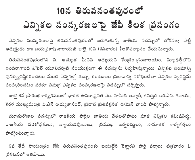 In his keynote address at a national seminar on electoral reforms, Dr. JP said that modern day kleptocrats, irrespective of the party to which they belong, have mastered the art of plundering State funds and perpetuating poverty among the masses by throwing a few crumbs at them. Instead of getting indignant, the masses feel grateful for the sops they receive. The country’s future will be bleak if such status quo-ism is not ended.