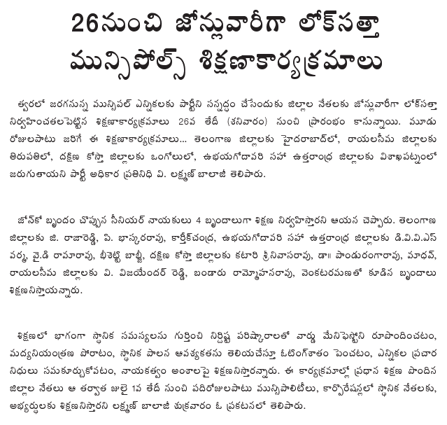 The Lok Satta Party is organizing training classes for its district leaders to galvanize them for the municipal elections scheduled to take place soon.