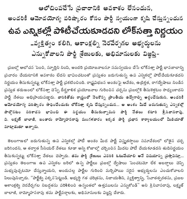 Talking to the media, party leaders Katari Srinivasa Rao, V. Laxman Balaji and Bandaru Rammohan Rao said that the party, after wide-ranging consultations, had decided to keep off the elections for two reasons. One, the prevailing tense situation will not permit it promote a healthy debate on safeguarding the interests of all sections of the people. Second, engaged as it is in finding a solution acceptable to all it is not fair for the Lok Satta to contest elections taking place precisely on the bifurcation issue.