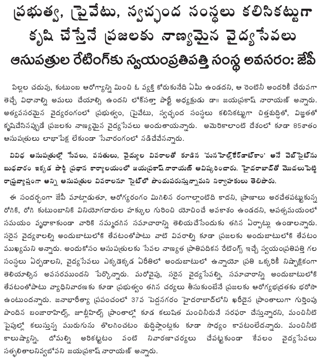 Mere provision of healthcare services would not guarantee healthcare, said Dr. JP and referred to supply of contaminated drinking water even in upmarket localities like Banajara Hills and Jubilee Hills. How could you ensure good health without making available safe drinking water and eradicating mosquito menace even in Hyderabad, the 37th largest city in the world, he asked.