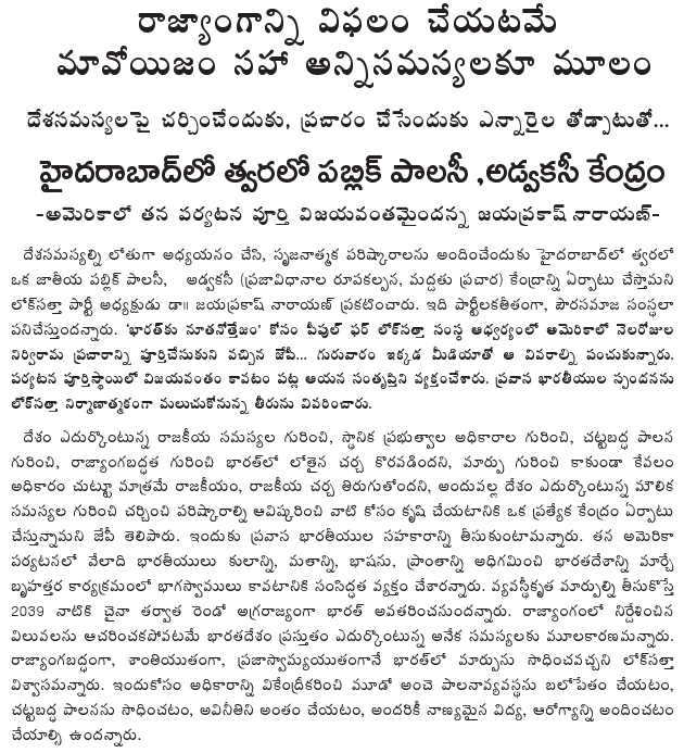 The Lok Satta President underlined that India has the demographic advantage and technological resources to leap forward economically in the next one decade. The Lok Satta has to provide the platform and compass for ushering in the certain change.