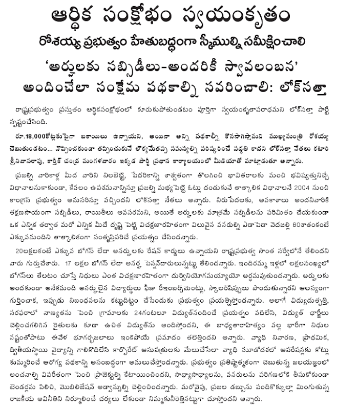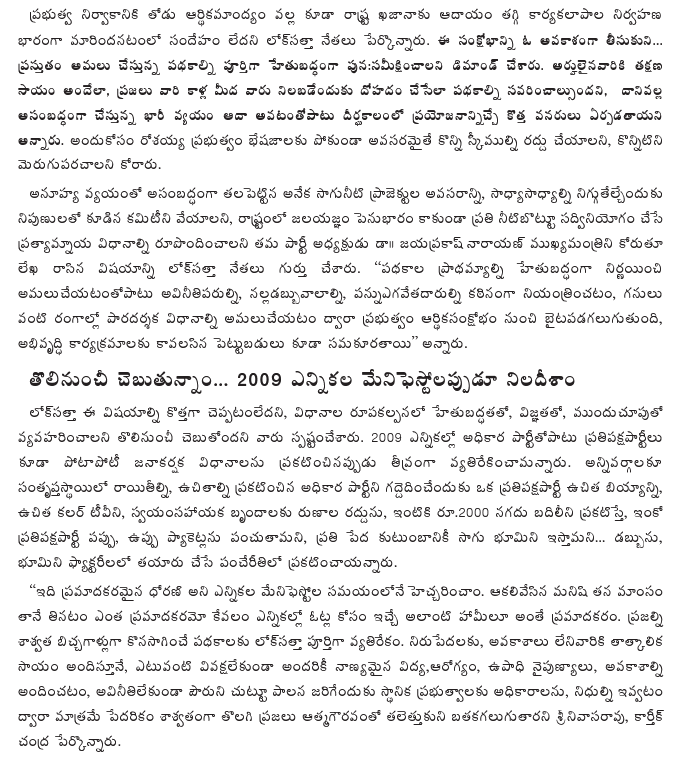The Lok Satta Party, the leaders recalled, sharply criticized the ruling and Opposition parties for indulging in competitive populism on the eve of the 2009 elections. It may be recalled that in their bid to unseat the ruling party which showered sops on all sections, one Opposition party promised free rice, a color television set, waiver of loans to self-help groups and cash transfer, and another party cultivable land to every poor family.