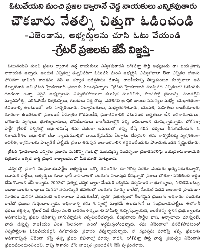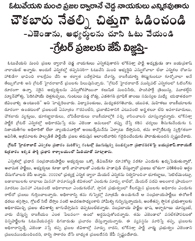 Addressing election meetings in Malakpet area, Dr. JP said that the traditional party contestants are not fools to throw away precious money down the Musi merely to get elected as corporators. They are looking forward to making many times their investment in the business of politics through umpteen ways ranging from collecting commissions from contractors and land grabbers to facilitating land dispute settlements and postings and transfers of officials.