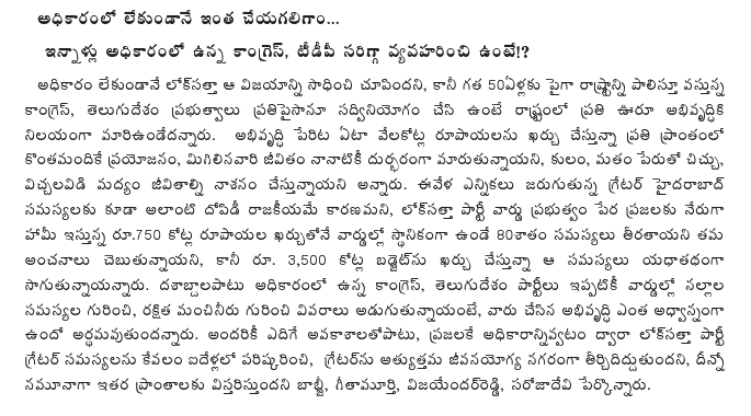 “The Lok Satta is the only party which has the determination and commitment to entrust people-elected committees with powers and resources to redress people’s grievances without making them run from pillar to post. The party will ensure that every ward in the GHMC receives a per capita grant of Rs.1000 so that the ward committee does not have any constraint of funds. The Lok Satta will implement a Citizen’s Charter under which the GHMC will pay a penalty of Rs.100 per day if a complainant’s grievance is not redressed within the specified time limit.”