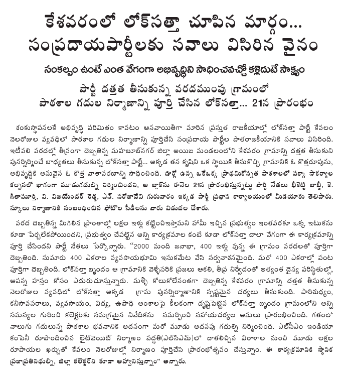 The Lok Satta Party had adopted the village to undertake all-round development following the trail of destruction left by floods in River Tungabhadra on October 2. Most of the 400 houses in the village with a population of 2000 were damaged and four hundred acres of land was sand-cast. The Lok Satta Party undertook a comprehensive survey of the problems of the village and submitted a report to the Collector.