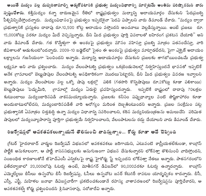 The Lok Satta leaders pointed out that already 70 lakh families have been ruined by the liquor evil. The Government liquor policy under which the shops are auctioned to highest bidders will result in proliferation of unauthorized outlets (belt shops). “People are already going without nutritious food in the wake of the escalation in the prices of essential commodities including pulses. If they fall victim to the liquor menace, their health will be in ruin.”