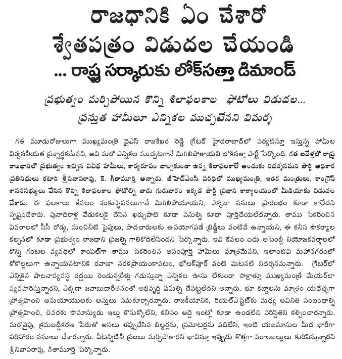 The Lok Satta Party demanded that the Government publish a white paper on the promises it had made and fulfilled in the last five years since the Chief Minister’s claim of having spent Rs.5551 crore on development works in Hyderabad city seemed incredible.