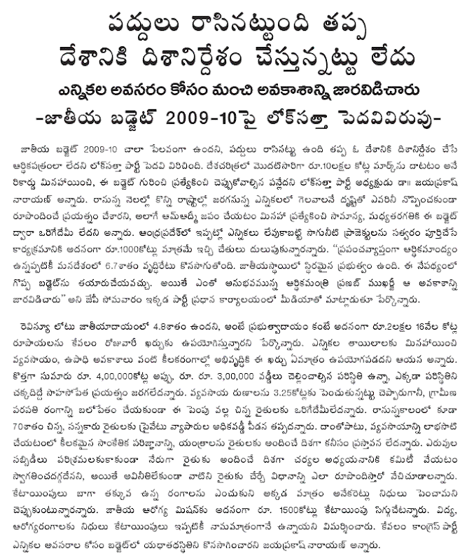 Talking to the media, Lok Satta Party President Dr. Jayaprakash Narayan said that Union Finance Minister Pranab Mukherjee had formulated the budget with an eye on the elections in a few States in the next few months. He allowed the golden opportunity to craft a historic budget in the context of a global recession and a stable government and steady growth in the Indian economy in the country to slip through his fingers.