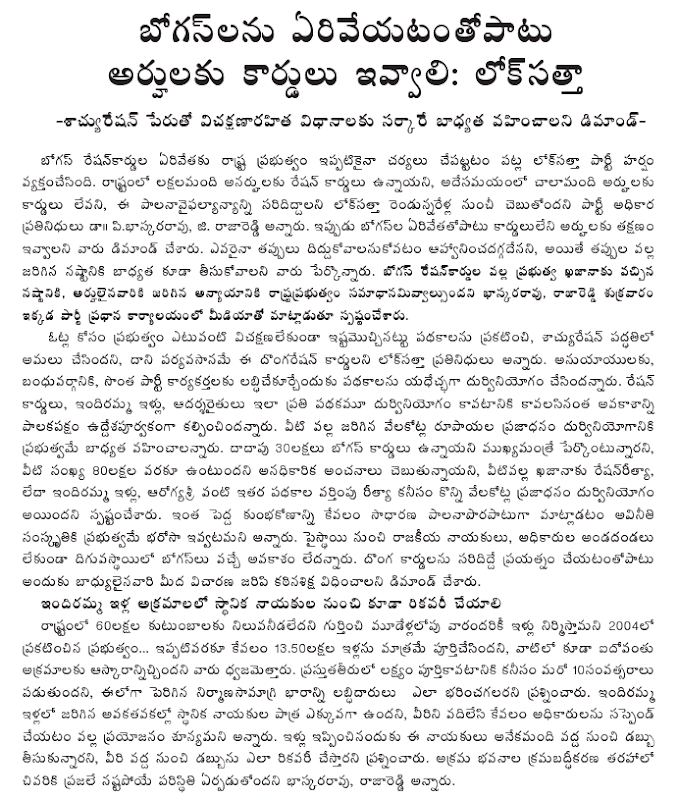 The Lok Satta leaders also demanded that the Government recover the money siphoned by ineligible beneficiaries and local leaders in the implementation of the INDIRAMMA housing scheme, instead of merely punishing employees.