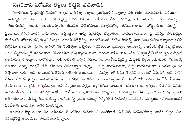 The Lok Satta staged a street play at Indira Park highlighting the travails the common man is forced to undergo because of Government negligence in day-to-day life. To name a few, he has to live with open drains and manholes without covers, polluted air and unhygienic eating places, adulterated liquor and non-functioning streetlights.