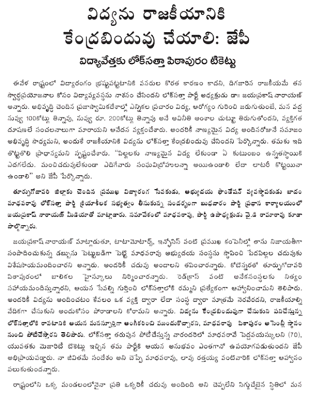 Dr. JP said he would try to dispel the impression among sections of people that a vote to an ethical party will go waste. He would tell them that voting for dynastic and corrupt parties is suicidal and that a vote to any party other than the Lok Satta will go waste. A vote to the Lok Satta alone is good for the voter and the State.”