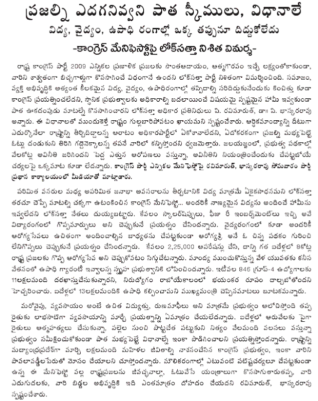 Lok Satta Party spokesmen P. Ravi Maruth and Dr. P. Bhaskara Rao said that the manifesto did not promise free and quality education and health care to all, irrespective of their caste or religion. It was true that nearly 225,000 people had been enabled to undergo surgeries under Rajiv Arogyasri. Advertising this, the Congress sought to conceal the fact that millions of people do not benefit under Arogyasri.