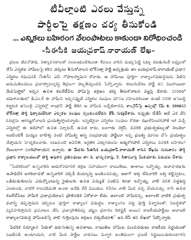 The Lok Satta President pointed out that vast quantities of liquor are consumed, mostly through these unauthorized and illegal belt shops during electioneering and on the eve of polls. "Needless to say, most of this liquor during electioneering is bought by the contesting candidates, and distributed freely for periods ranging from one week to four weeks. The first taste of liquor for most people is during elections."