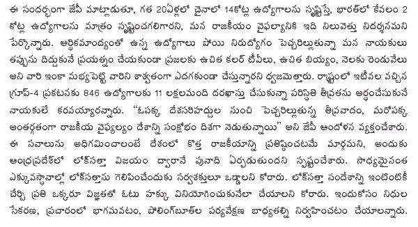 “The Lok Satta is committed to providing free universal and quality education and health care and job-oriented skills and employment opportunities to every child, and making agriculture and traditional occupations lucrative. It will create 1250 towns at a cost of Rs.40000 crore spread over five years to provide employment opportunities to five million people. It will make a per capita grant of Rs.1000 to every village and town so that people at the grassroots can spend it on projects they need, without looking to authorities at the district or State level. It will provide social security to one crore families belonging to the unorganized sector.”