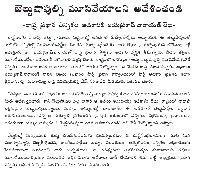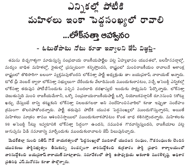 “I now humbly bow to the wishes of all of you who, transcending caste and religion, region and language, would like me to represent you in the Assembly.” But Kukatpally is only the starting point; the Lok Satta will change the course of politics in the country, not merely in Andhra Pradesh.”