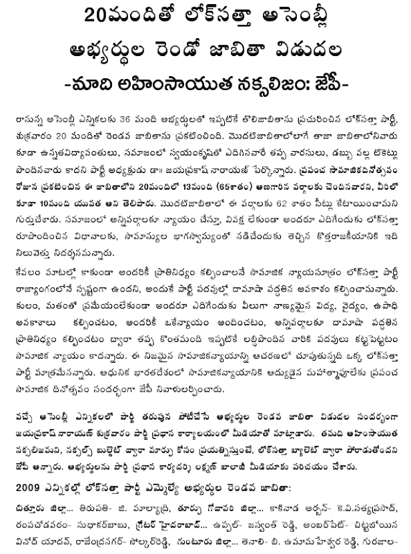 Releasing the party’s second list of 20 candidates contesting the ensuing elections to the Legislative Assembly, Dr. JP disclosed that Mr. Sudhakar Babu contesting from Rampachodavaram in East Godavari district is former extremist who had wielded arms earlier. He had joined the Lok Satta Party and come forward to contest believing in the party philosophy that a ballot is much more lethal than a bullet in changing the course of politics and history.
