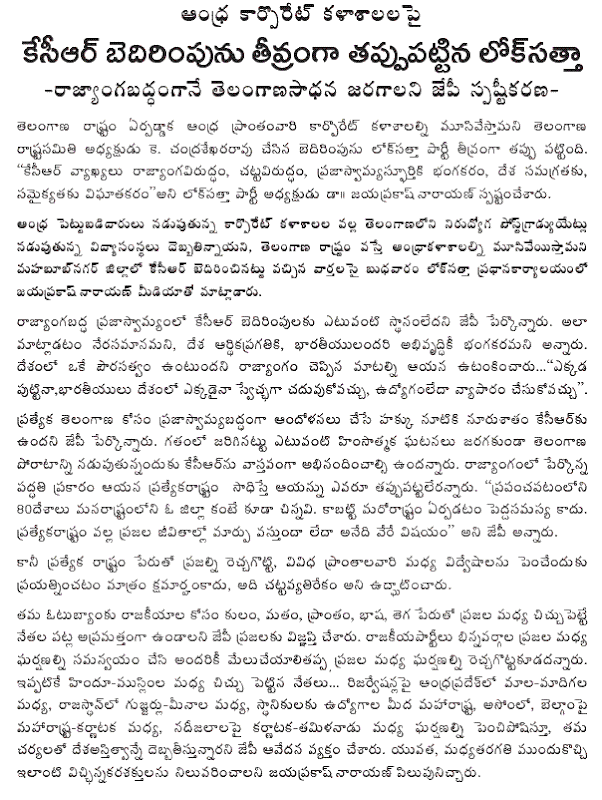 Lok Satta Party President Dr. Jayaprakash Narayan today took strong exception to Telangana Rashtra Samithi (TRS) President K. Chandrasekhara Rao’s threat to shut down corporate educational institutions being run by Andhra corporate entities once the Telangana State is carved out. “KCR’s threat is unconstitutional, illegal, undemocratic and detrimental to the unity and integrity of the country,” Dr. JP told a media conference here.