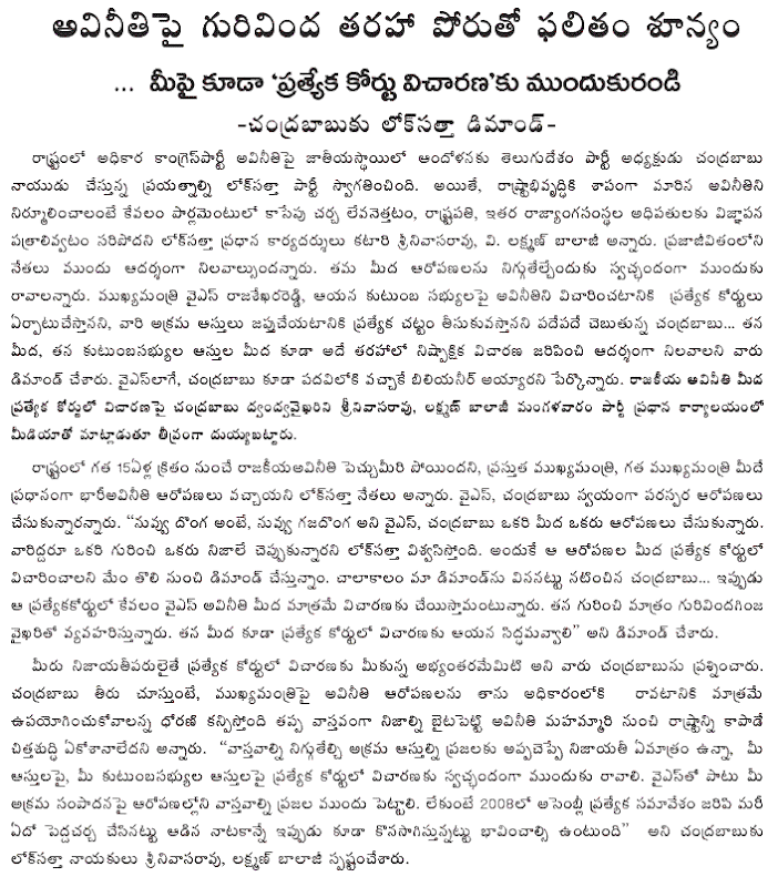 Dr. JP said Mr. KCR is entitled 100 percent to agitate for a separate Telangana State by utilizing all the democratic means available. “In fact, Mr. KCR should be complimented for having led the agitation so far without triggering violence as in the past.” None can fault him if he got a separate Telangana formed by adhering to the procedure laid down in the Constitution. “The formation of a separate Telangana State is not a big deal when it is realized that there are more than 80 countries in the world which are smaller than a district in Andhra Pradesh. Whether a separate State will bring about any transformation in the lives of the people is altogether a different issue.”