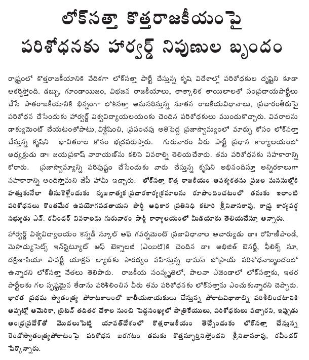 A team of world-renowned researchers and experts in politics is planning to study the Lok Satta Party's campaign for new politics in AP. This study would be conducted jointly by the experts from Poverty Action Lab – MIT – Harvard University. The team will be conducting an independent and objective study on the nature and conduct of the Lok Satta Party's election campaign. In particular, the team would be studying the progress of Lok Satta Party's clean politics campaign being conducted in an atmosphere of money-and-muscle power, narrow and divisive politics and the heights of 'freebies' populism.