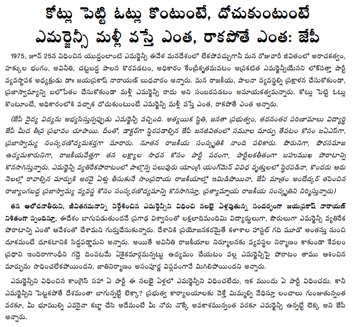 కోట్లు పెట్టి ఓట్లు కొంటుంటే, దోచుకుంటుంటే ఎమర్జెన్సీ మళ్లీ వస్తే ఎంత, రాకపోతే ఎంత: జేపీ Wednesday, June 24, 2015 - 15:02