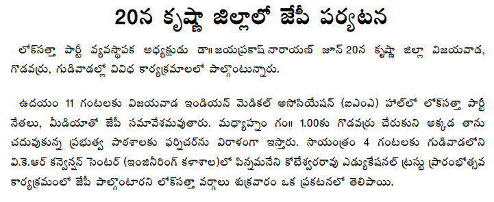 The following is the text of Loksatta Party founder President Dr.Jayaprakash Narayan’s letter to the Hon’ble Prime Minister, Union Home Minister and Governor of AP and Telangana.